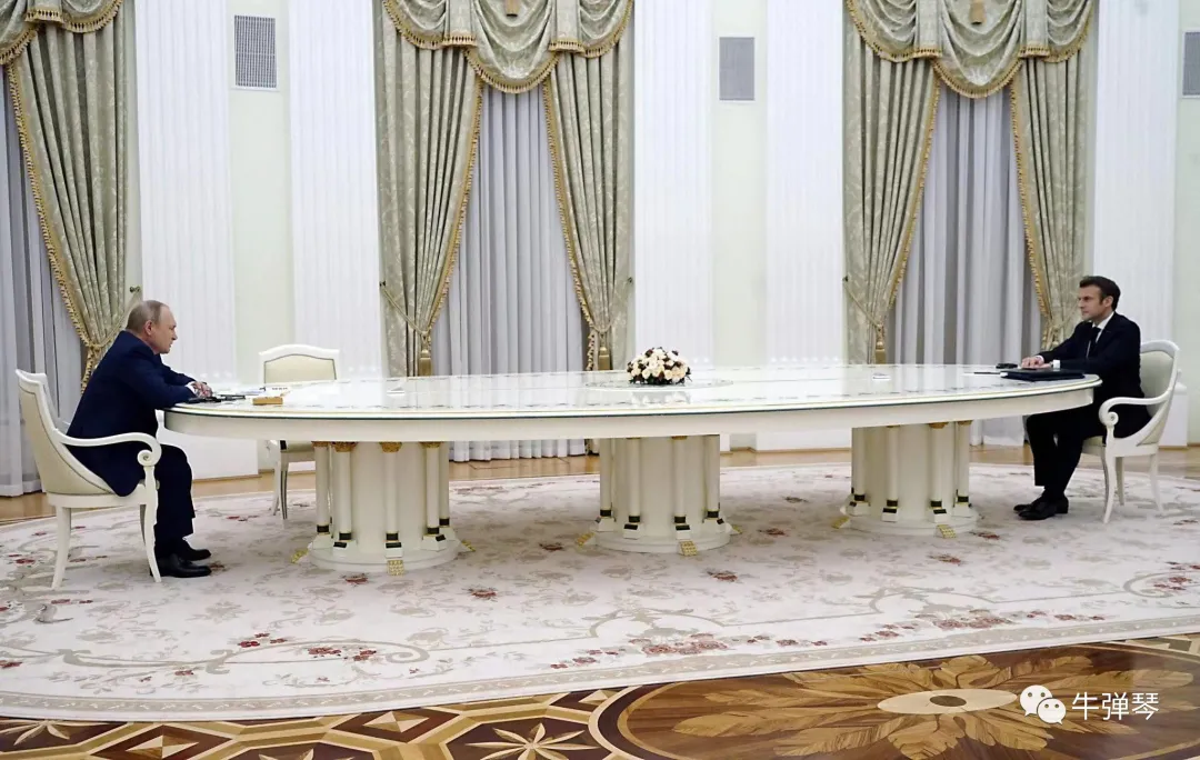 事实上,当年疫情期间,普京在克里姆林宫接待马克龙,接待朔尔茨,就是一张长条椅,普京坐这一端,马克龙等坐那一端,这都让欧洲人很难接受,认为遭到了羞辱。