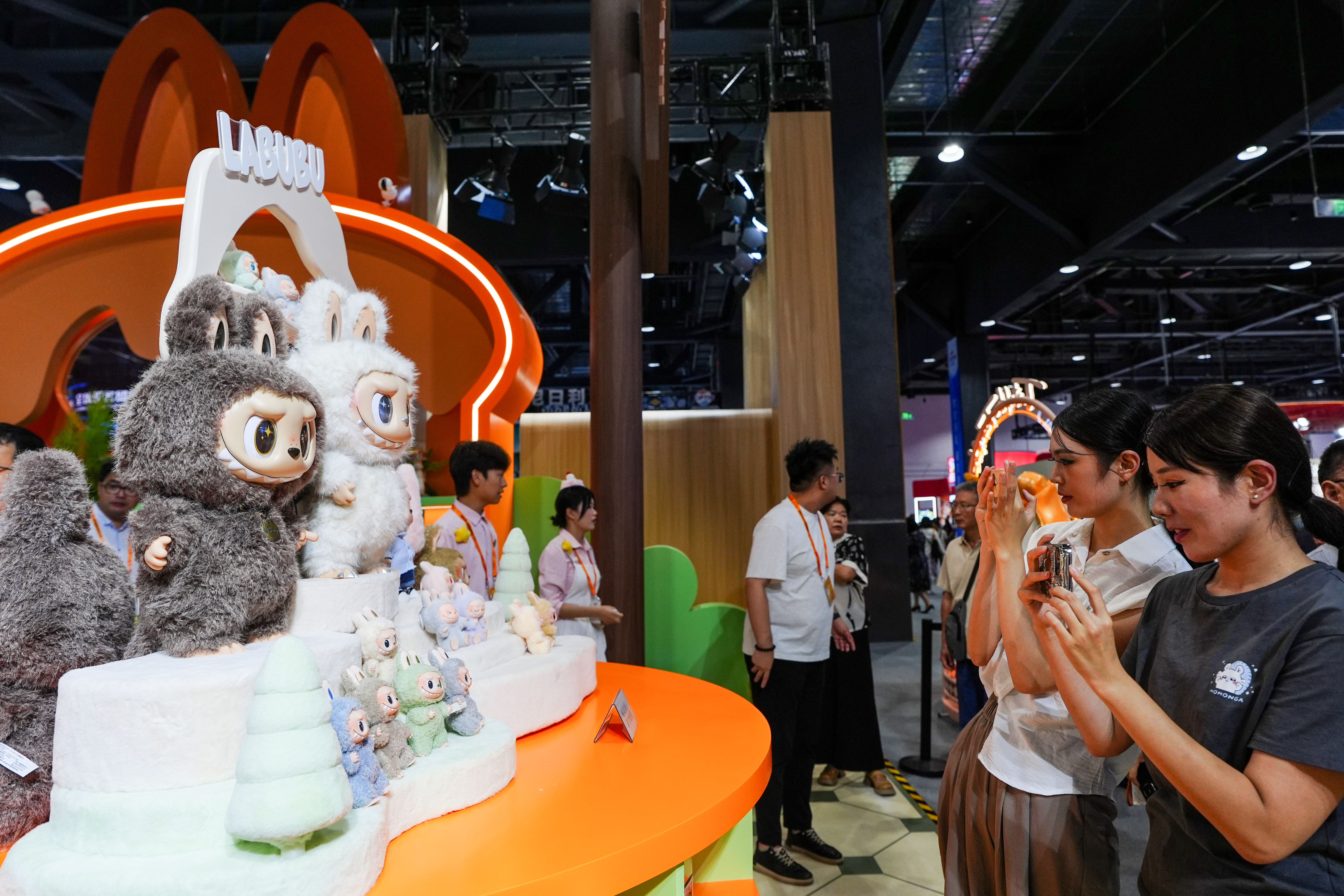 2025年9月12日,在2025服贸会泡泡玛特展位,参观者拍摄LABUBU玩偶。新华社记者 陈晔华 摄