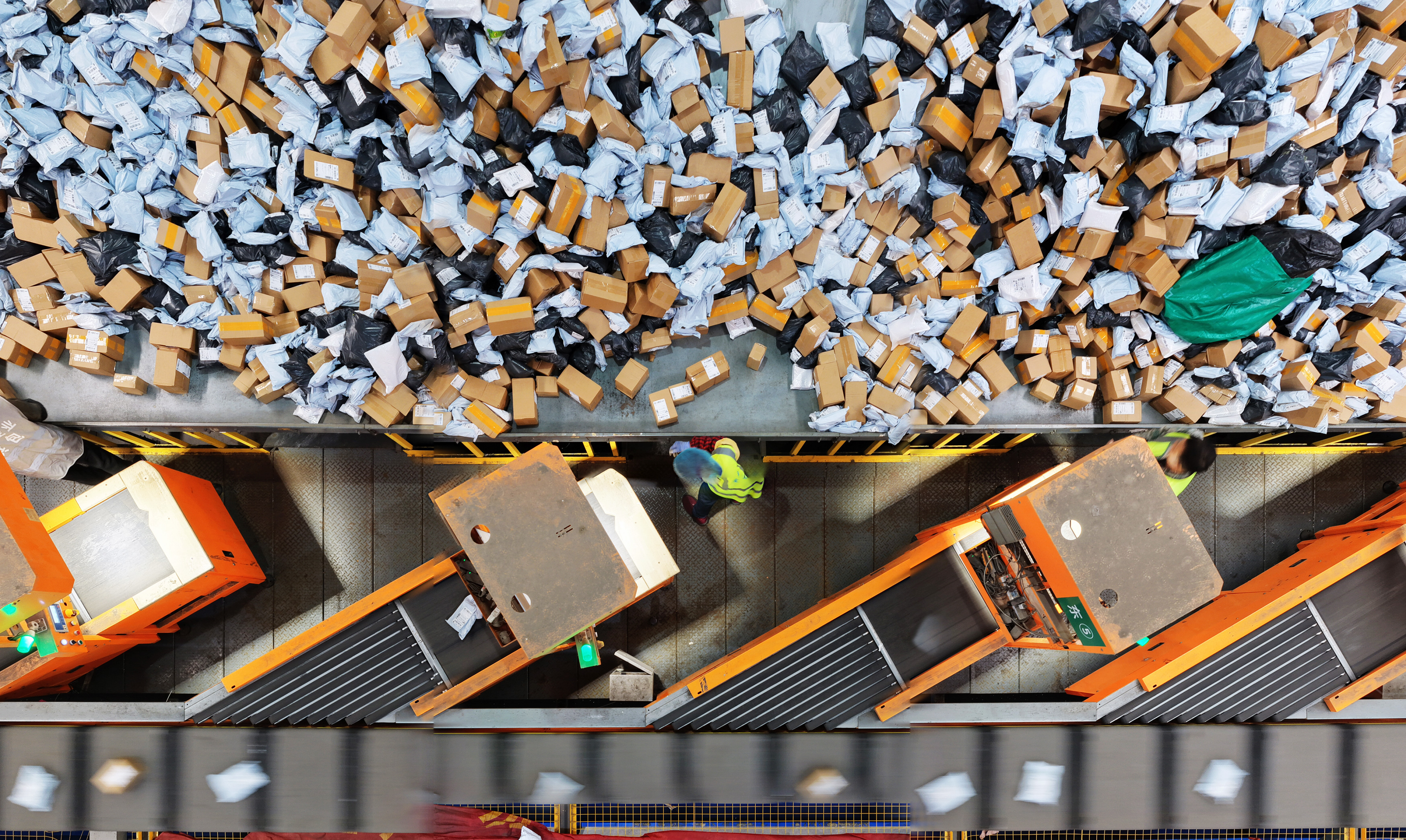 2025年11月10日,在中国邮政集团有限公司江苏扬州邮件处理中心,工作人员分拣快递包裹(无人机照片)。新华社发(孟德龙摄)